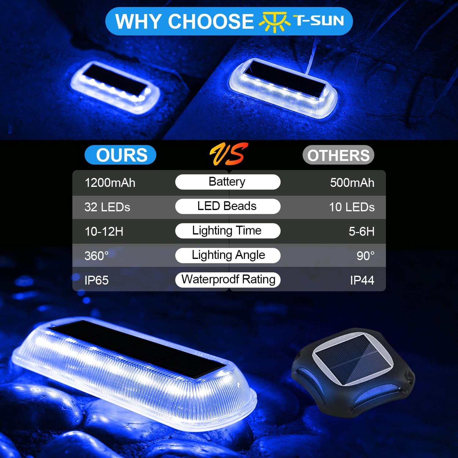 - ⛈️【IP68 Waterproof】T-SUN outdoor solar lights waterproof made with durable PC material, adopt fully enclosed integrated design so they are waterproof up to IP68. This dock lights for outside can withstand all kinds of weather conditions, including rain, snow and frost which commonly used as solar driveway light, solar deck lights and walkway lights.