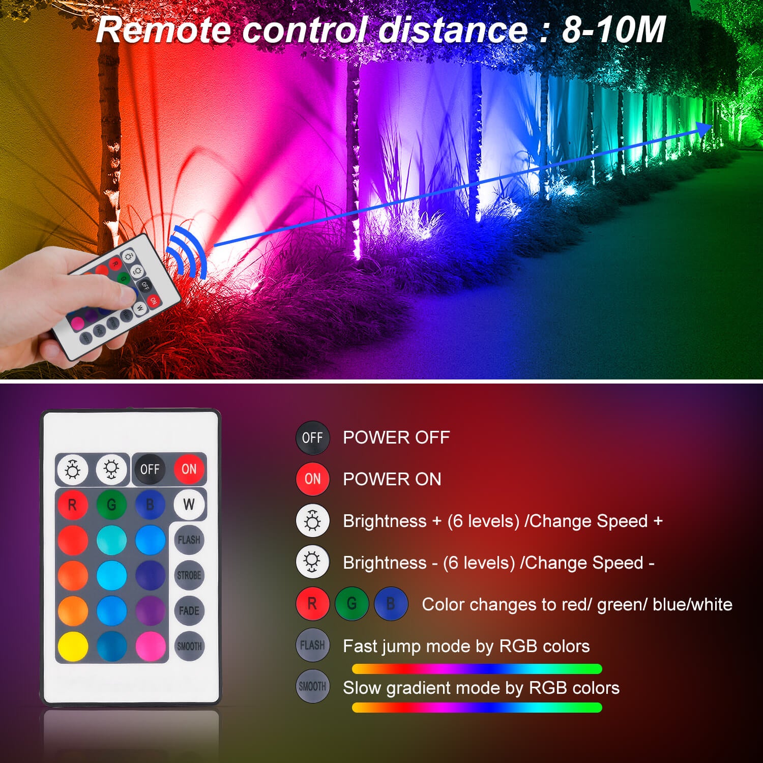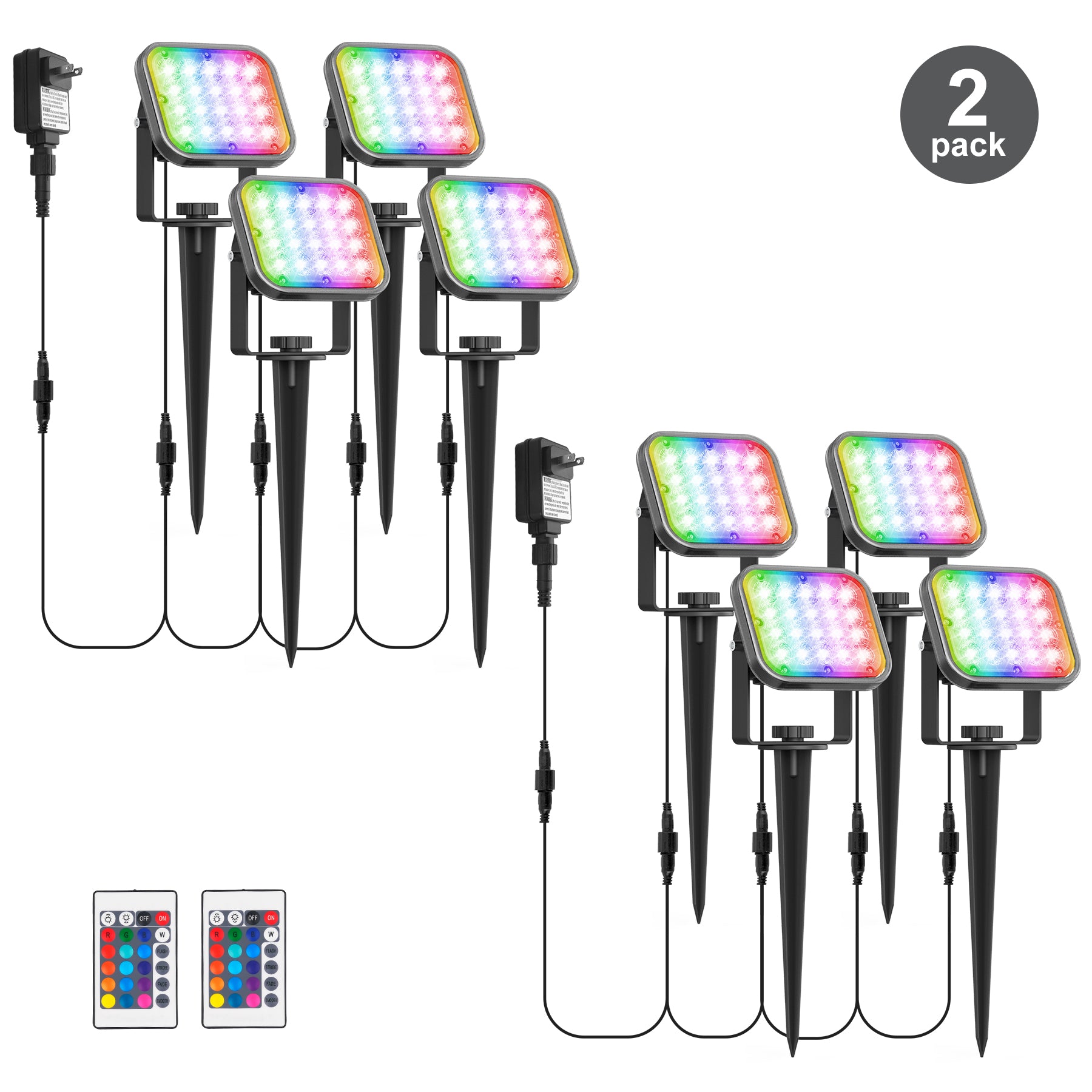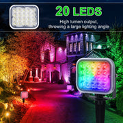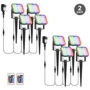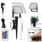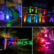 • Remote Control RGB Spotlight - Landscape spotlight with 16 beautiful colors, 4 light effect modes, and adjustable brightness, provides a great light show at night. You can change their color and mode via the wireless remote within an open 30m/98ft range. RGB garden lights remember your last color settings. No need to reset when powering on. ⭐Note: 4 lights can only light up one color at the same time; for the first time, please press the "STROBE" and "FADE" buttons at the same time to activate the lights.