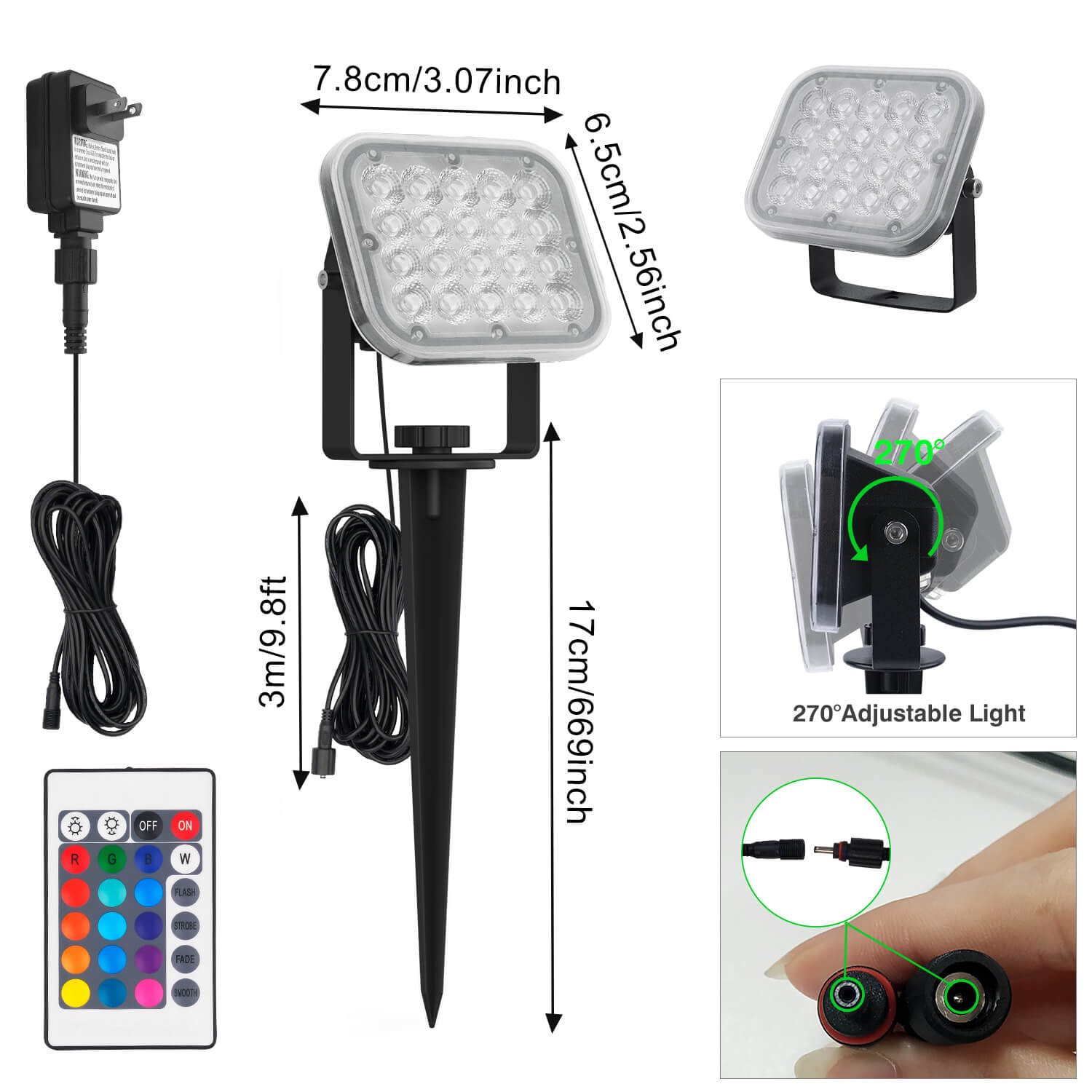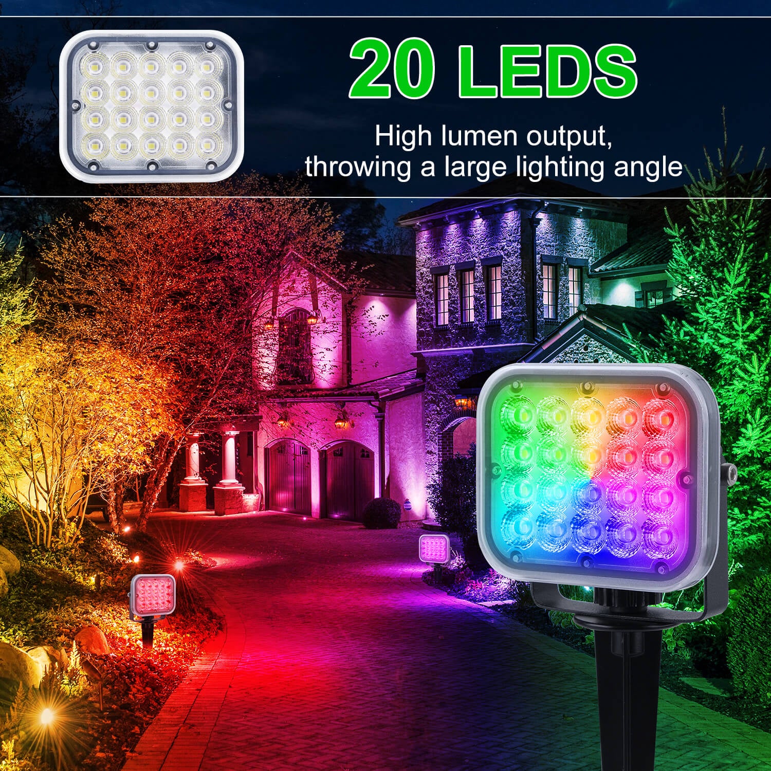 • Super Bright Spotlight - RGB Outdoor Spotlight is equipped with 20 high-quality LED light beads for a larger bright area and RGB color changing light. 90° beam angle and 270° adjustable headlights illuminate every corner of your location. Make your garden more attractive and decorative with high lumen output at night.