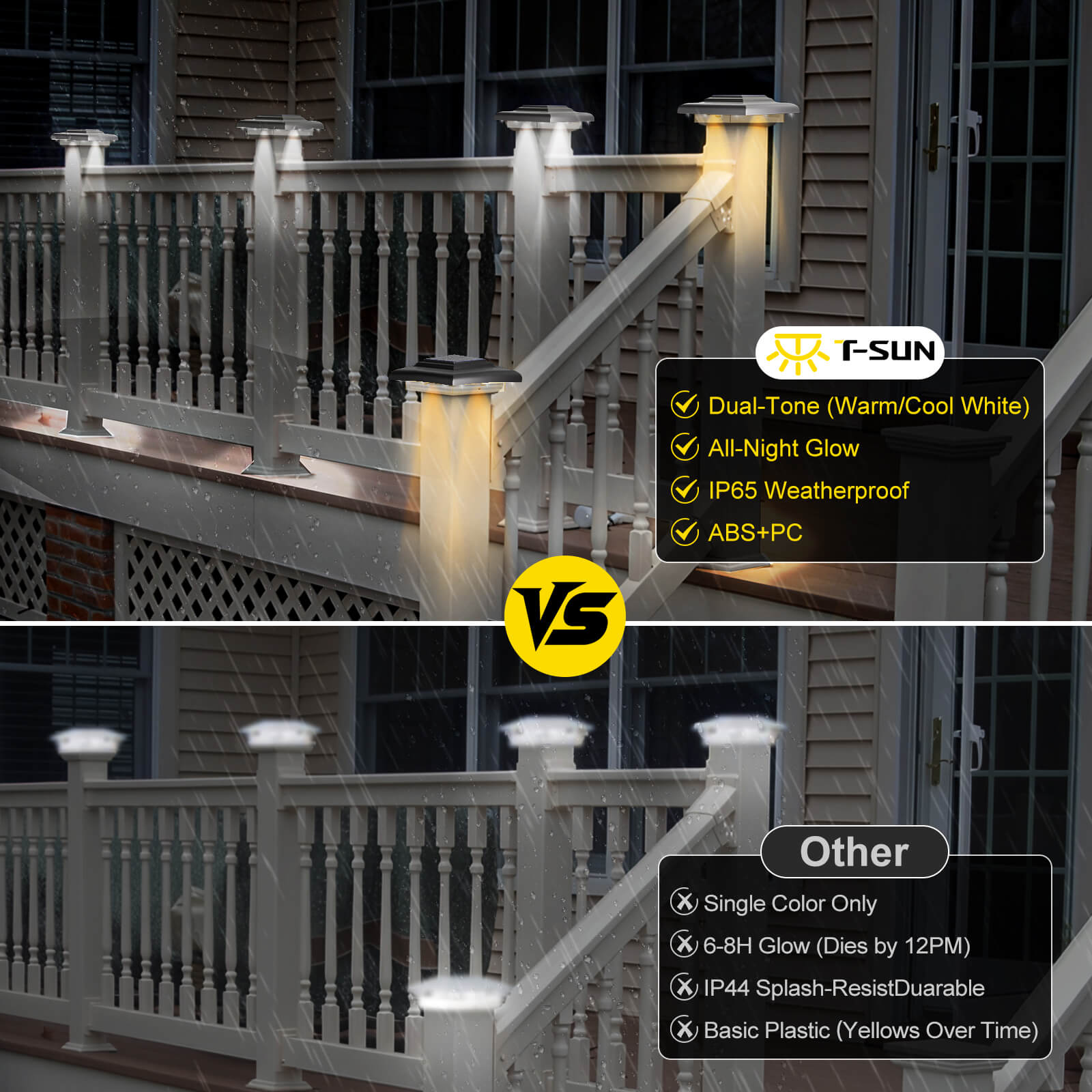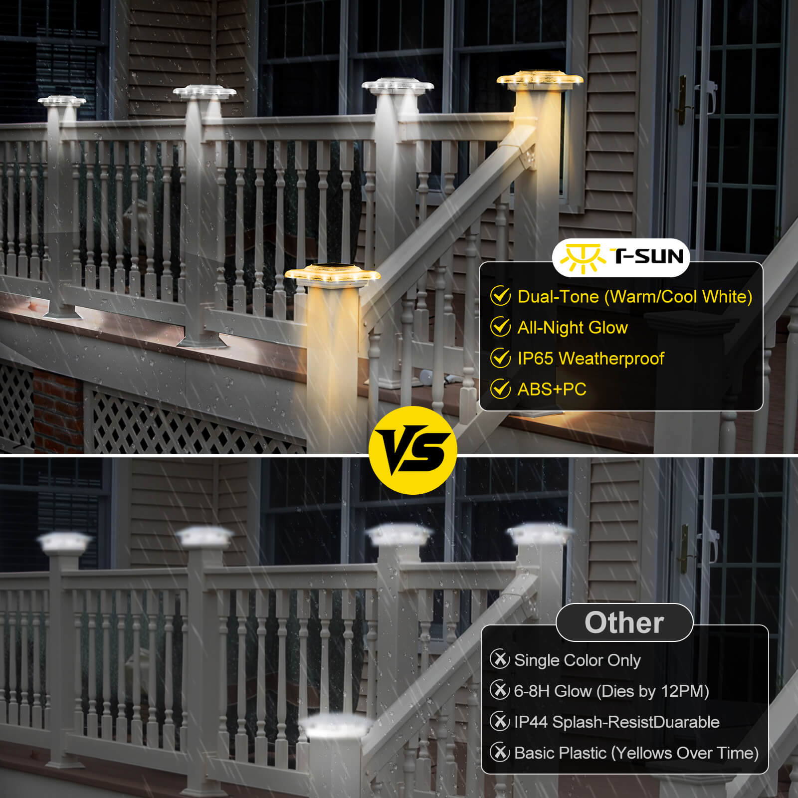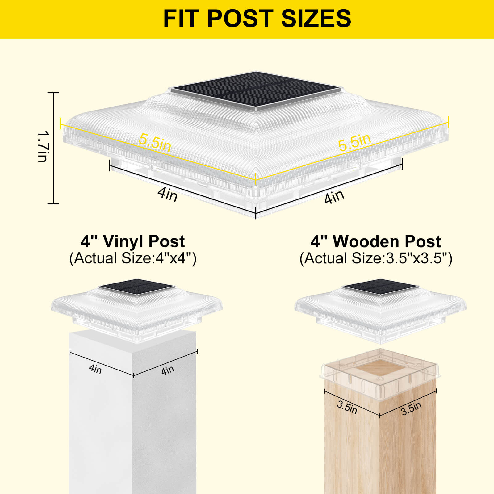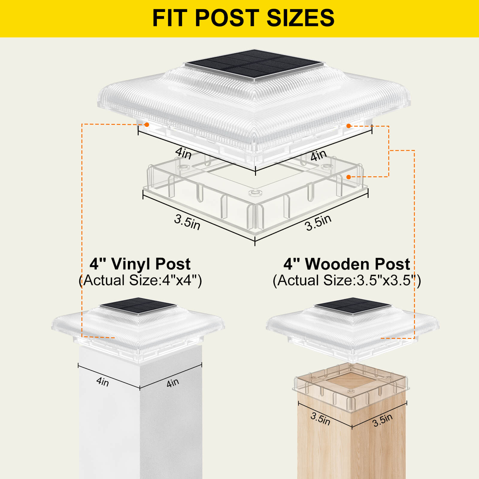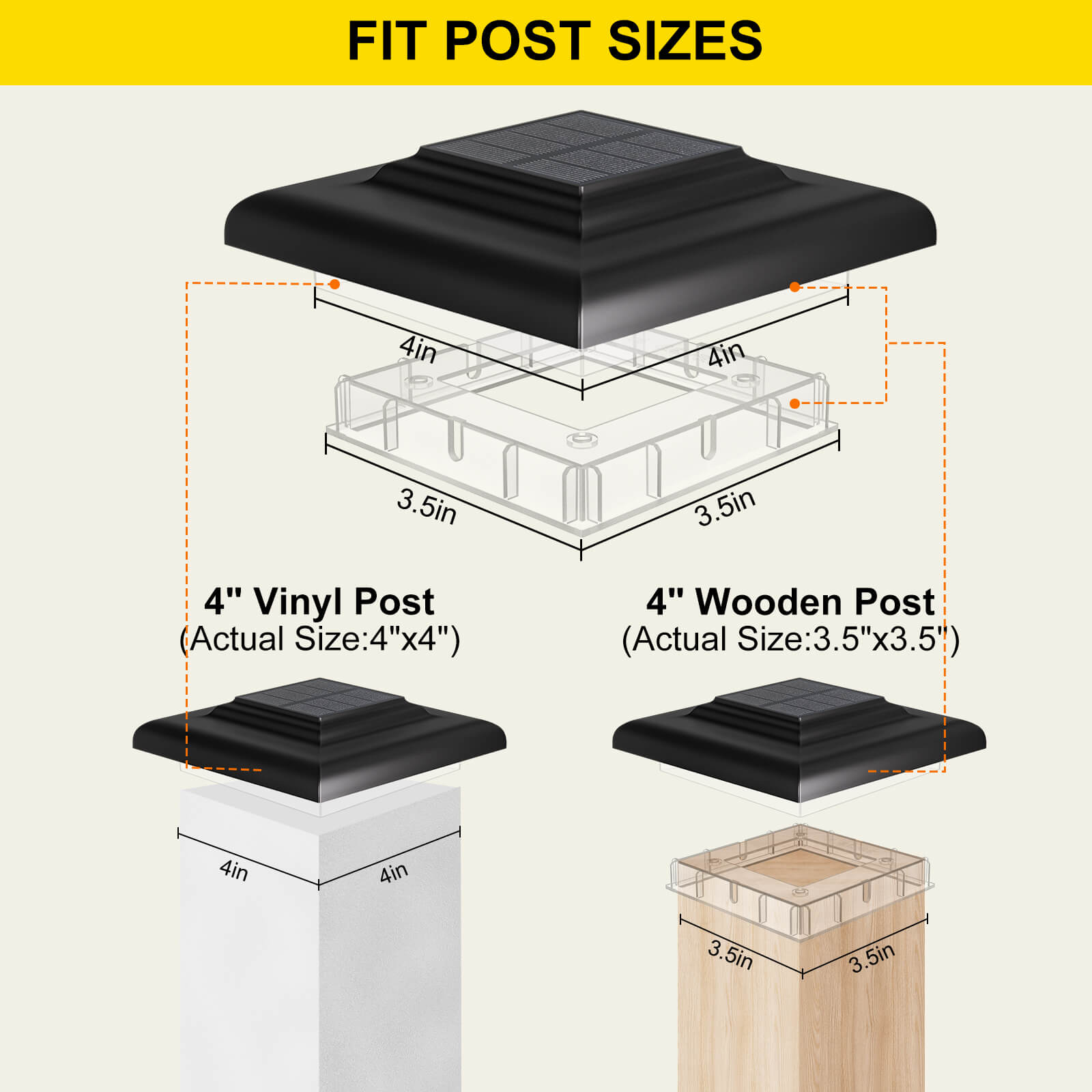 - 【2 Size for You Choose】T-SUN solar post cap lights suitable for 4x4 wooden posts(3.5x3.5" actual) , 4x4 vinyl posts(need to remove 3.5*3.5in base to install). No wiring needed—just secure with 2 screws through the pre-drilled holes for a quick, tool-free install.