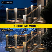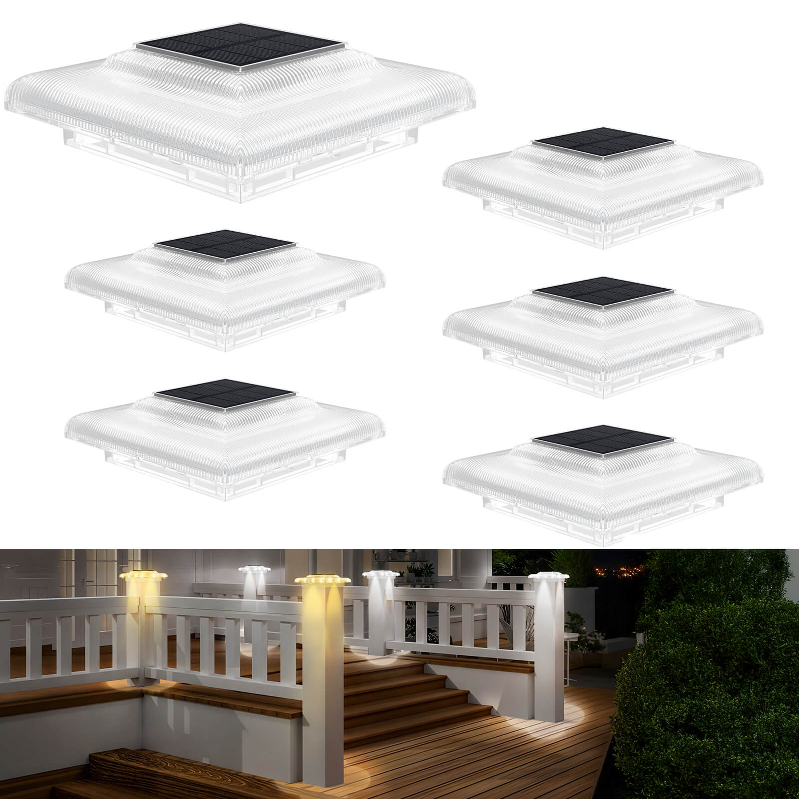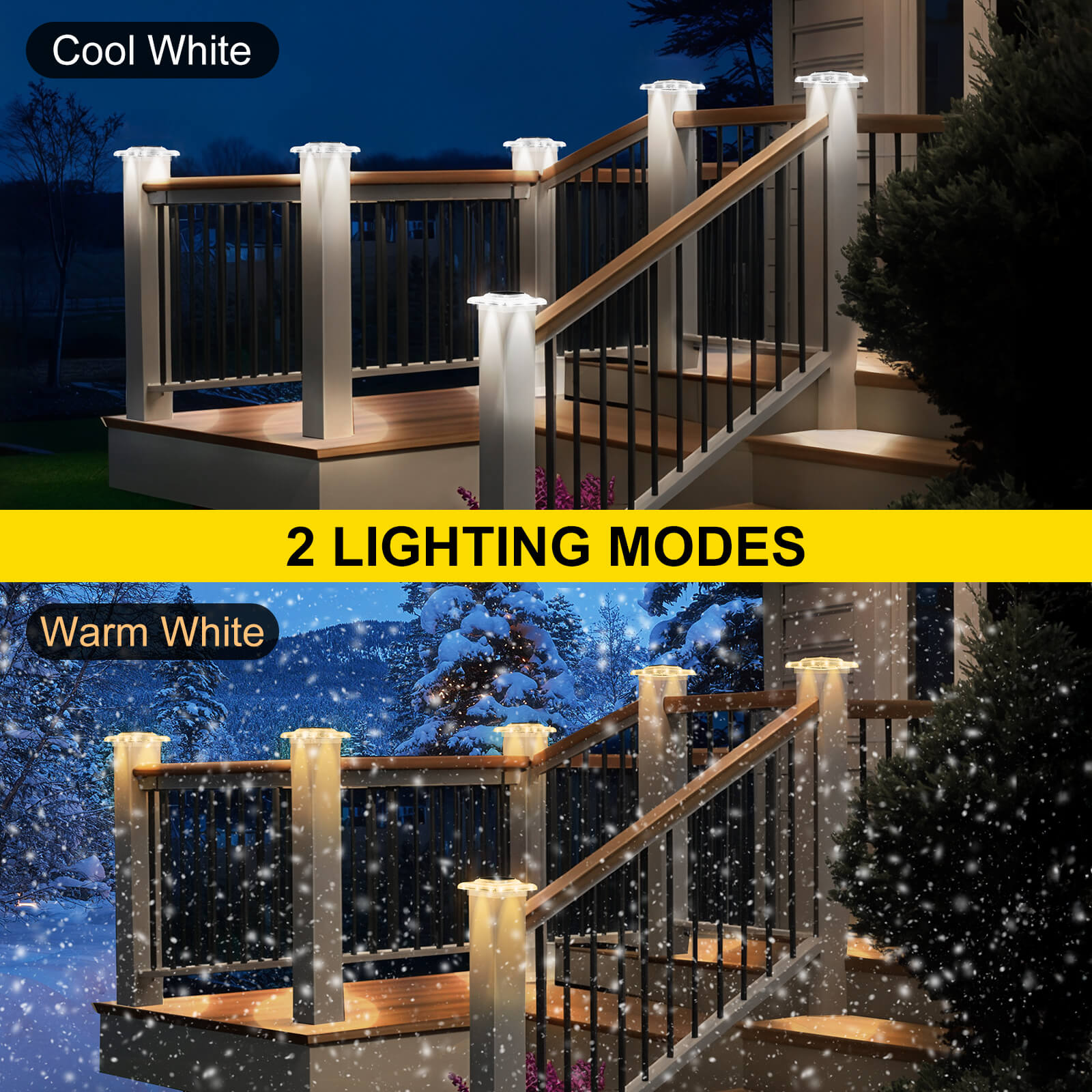 - 【2 Color Modes】Our post cap lights solar powered with 2 beautiful lighting modes:3000K Warm White( cozy evenings) and 6000K Cool White(bright security). The solar post cap lights are equipped with 12 pcs LEDs,include 4 high-brightness lens LEDs. You can save on the step lights and making your yard simpler and more environmentally.