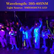 - Powerful Black Light: 100W black light with 108 units LED as well as uses SMD 3030 (Ultraviolet Light Emitting LED) as the light source, Wavelength:395-405NM, make your indoor and outdoor parties even brighter.