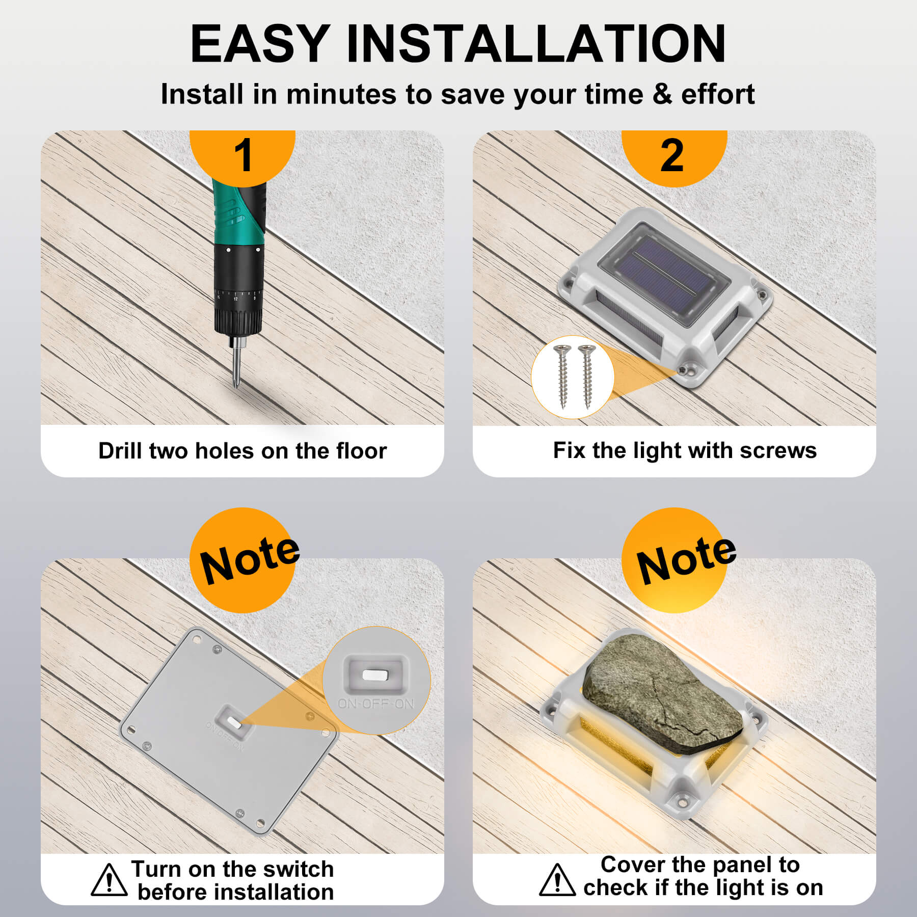 • Install In Minutes: LED dock lights can be quickly installed on any ground that can absorb direct sunlight. No wiring required, can be fixed with screws or glue, 32 screws are included in the package.