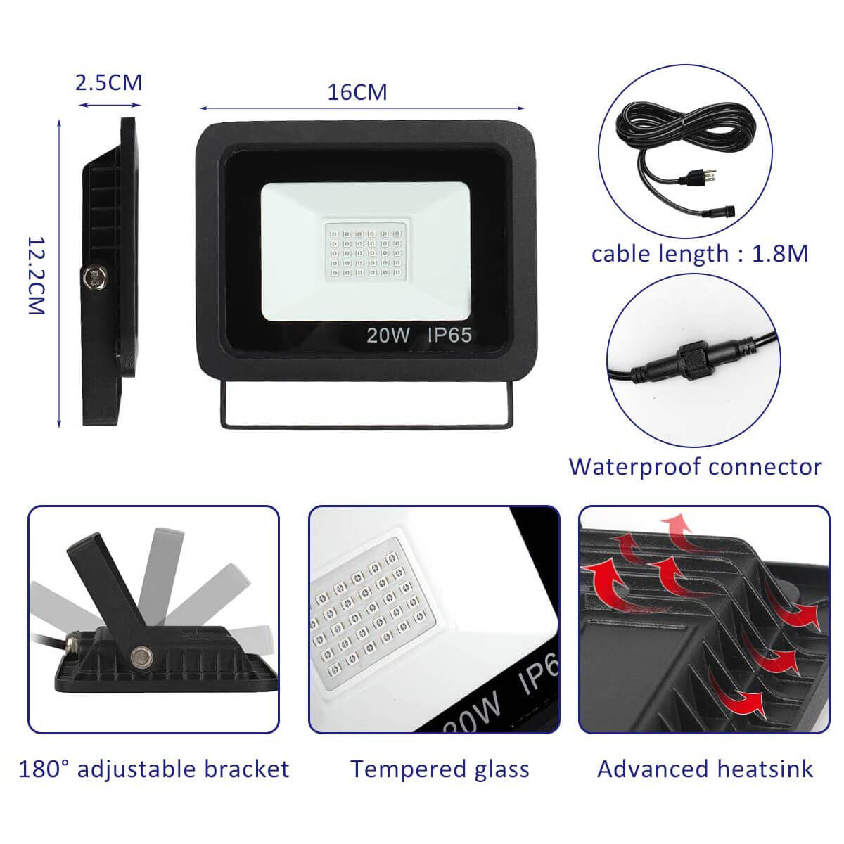 - IP65 Waterproof: The light's waterproof grade is IP65, able to withstand rains, but it can't work under water. Suitable for outdoor indoor use. High-quality chips which is much brighter and more durable than normal chips