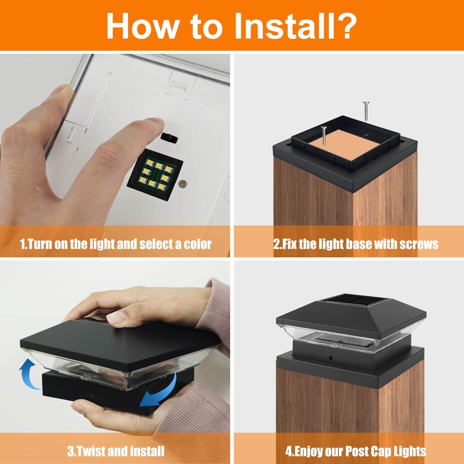 - 3 Size for You Choose: T-SUN solar post cap light simplify your outdoor lighting setup with our easy-to-assemble post cap light. The solar fence cap light come with 4x4 wooden post (ture size: 3.5 x 3.5), 4x4 vinyl post (ture size: 4x4), 5x5 vinyl post (ture size: 5x5). When you need to install our post cap lights, simply add screws to the two holes inside the large cap.