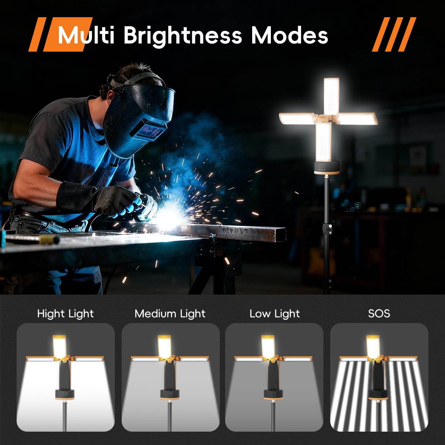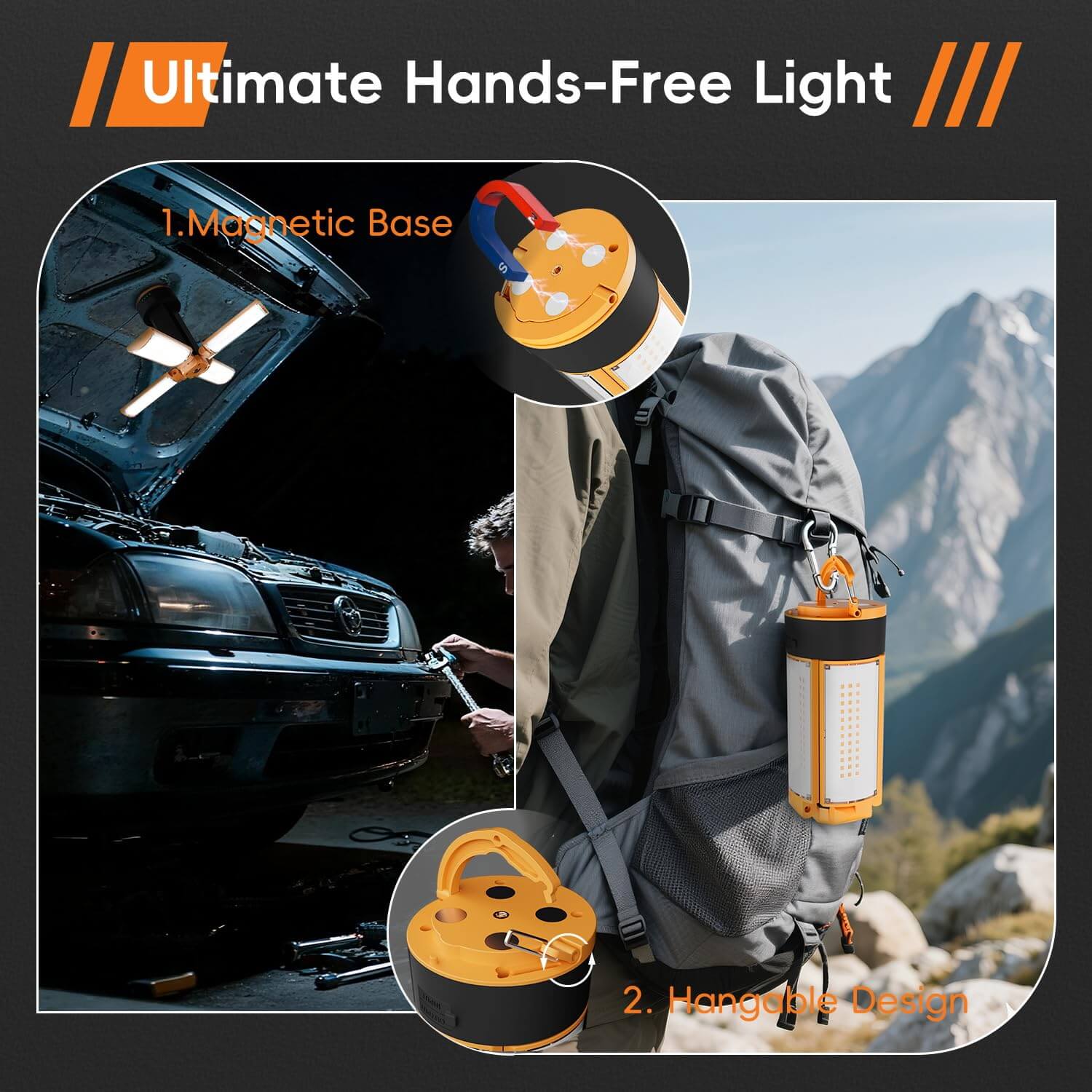 - Wide Range of Uses: This rechargeable work light with stand is versatile enough for garage projects, camping trips, magnetic mounting, tripod setups, indoor lighting, and emergency use during power outages. It’s ideal as a camping light, emergency strobe (with SOS mode), or outdoor gathering beacon