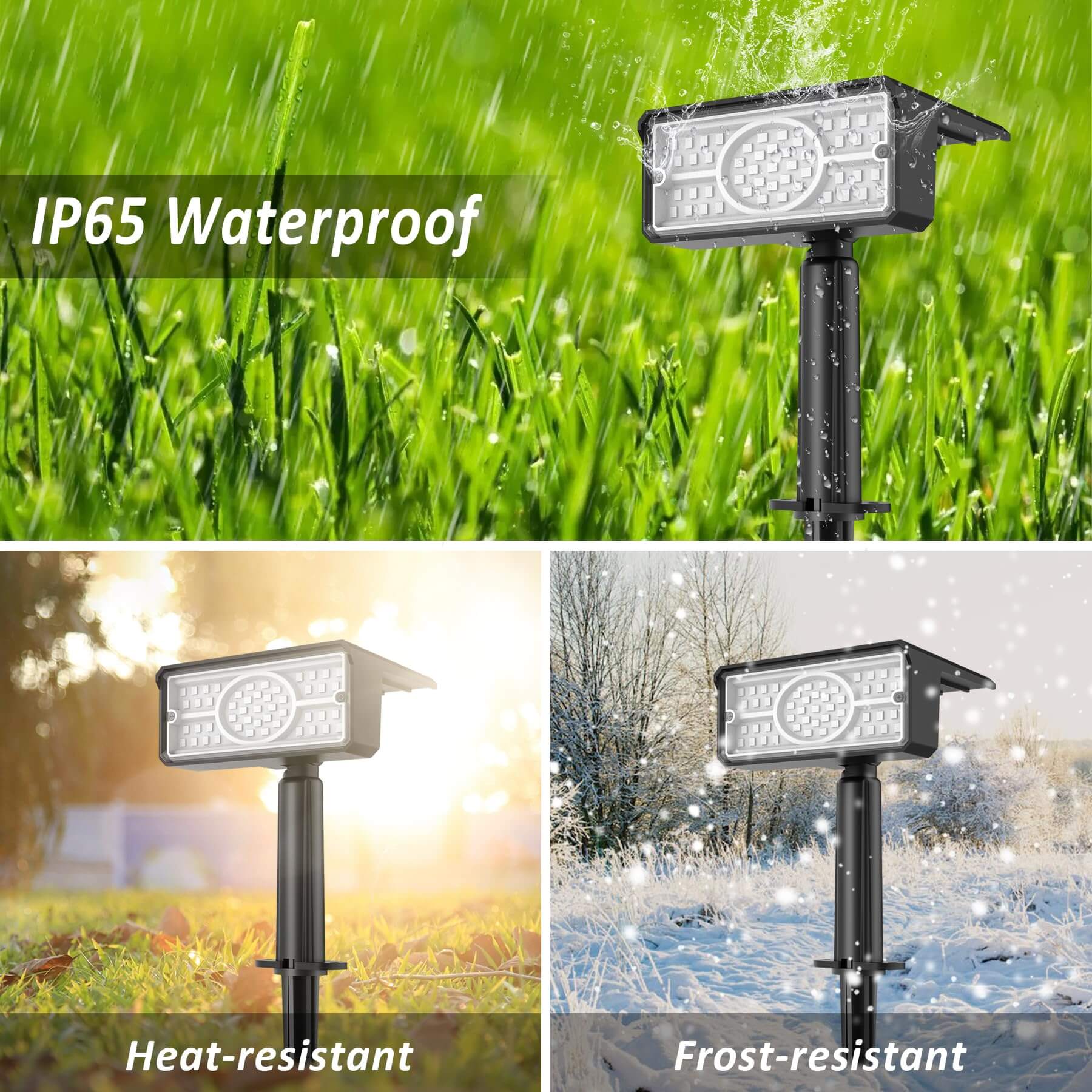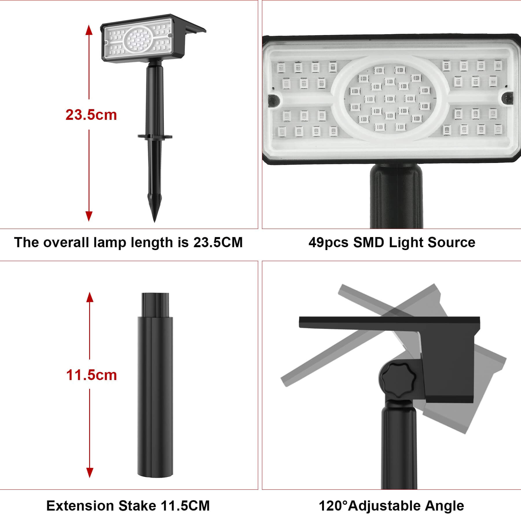 - 2 Installation Options: Our solar spotlights can stick into the ground with inserts or mount on the wall with the included screws. The included extension bar can meet your other installation needs.