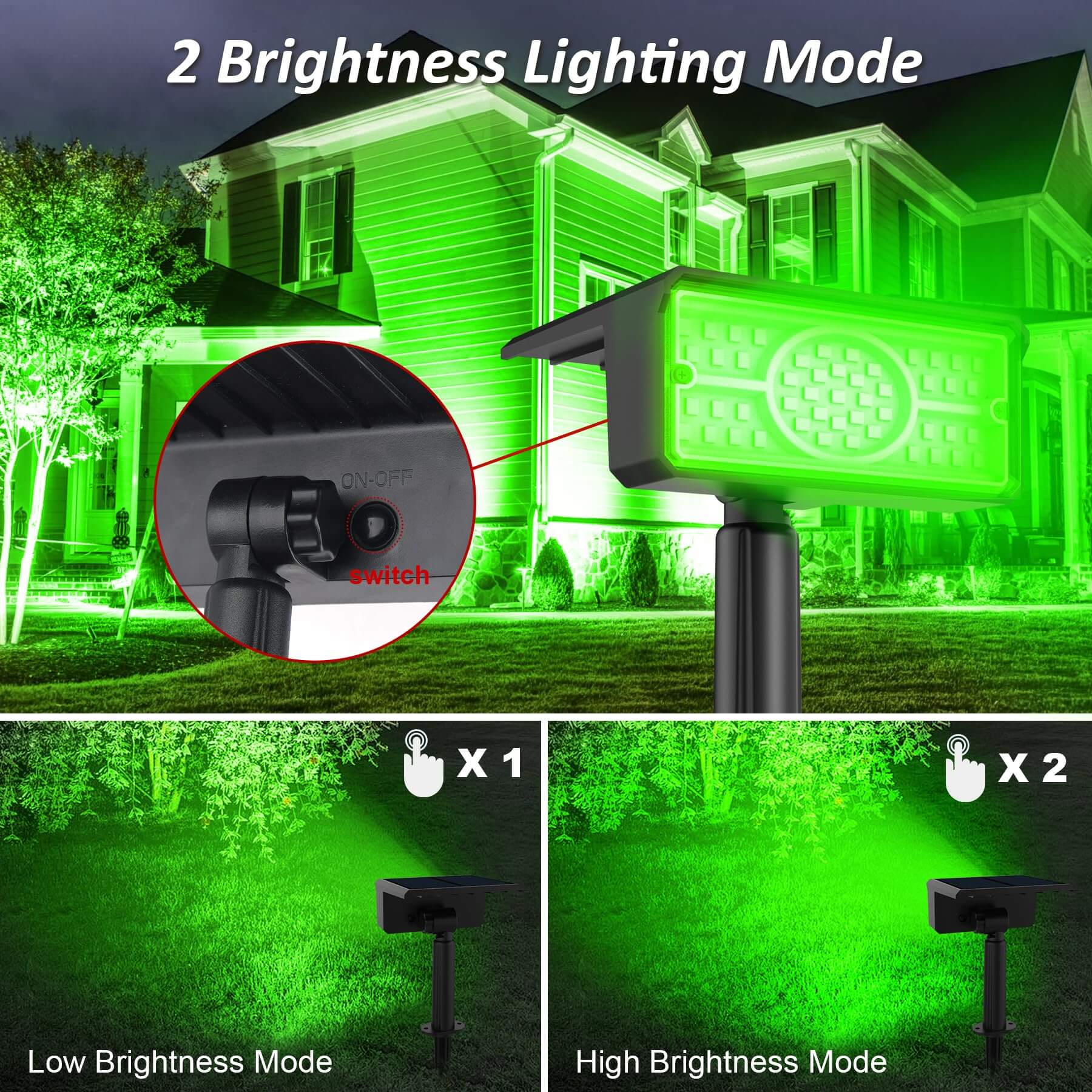 - Brighter Outdoor Green Solar Spotlight: 49 LEDs brighter, 392 LEDs total with 120°adjustable larger solar panel. So they produce up to 1000 lumens total of bright, green light in the dark, illuminating your garden and larger areas of your landscape. TSUN solar spotlights can illuminate a larger area and show perfect brightness compared to other 12 LED lights on the market.