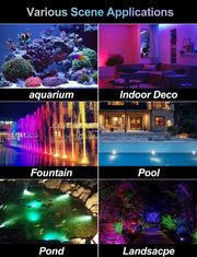 - APP Control & Remote Control: This 6pcs bright LED submersible light has 16 million colors and multiple scene lighting modes, multiple color changing modes, fixed color modes, music modes, timers, etc. 130ft control distance to meet your various needs. You can precisely customize any mode and color you like to create an elegant and vibrant water scene atmosphere. The included remote control allows you to adjust speed/brightness, on/off, adjust color/mode, timer for 30 minutes/1 hour. Tip: White is a RGB combination color, not true white.
