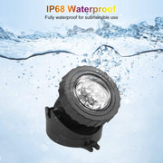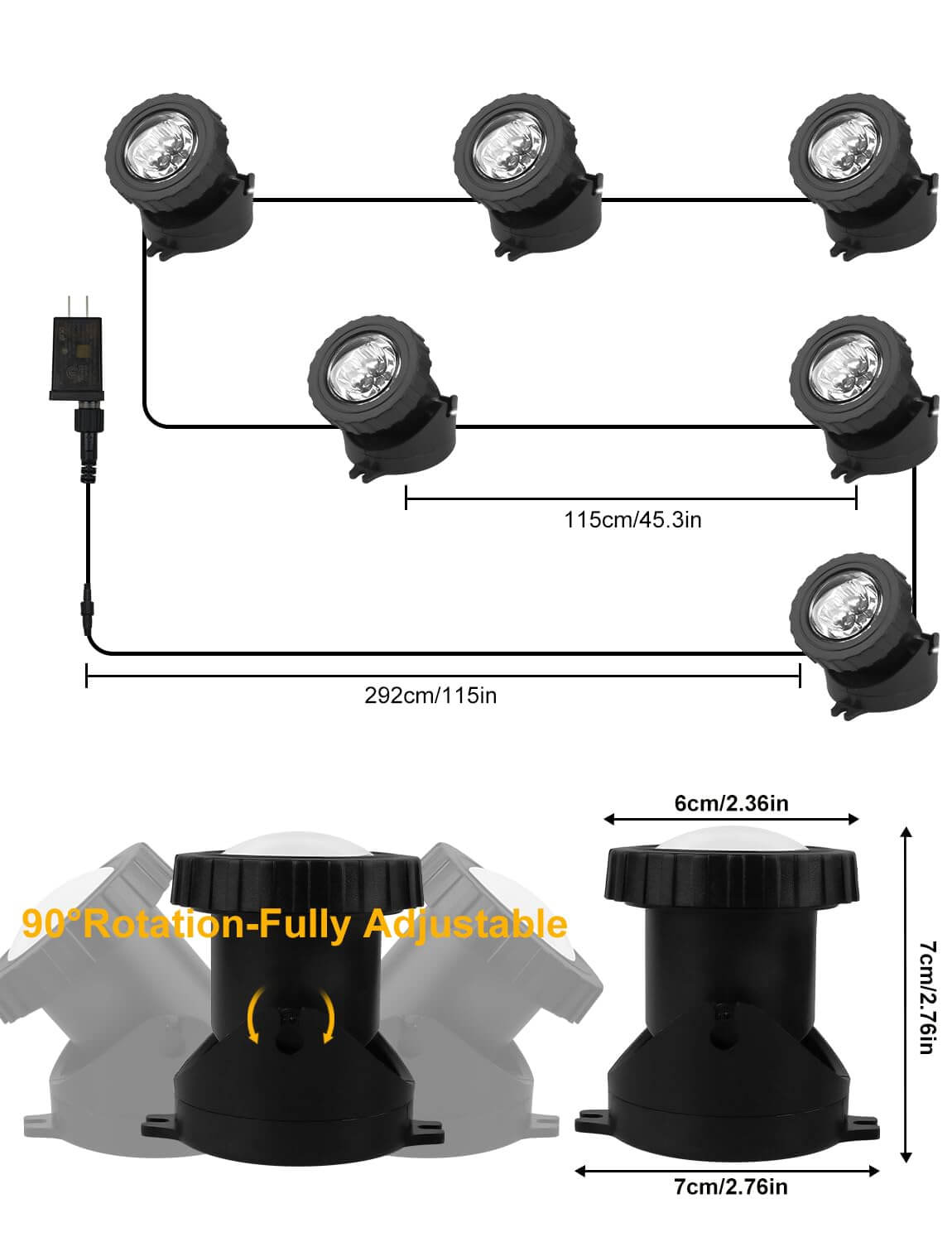 - Easy To Use & 2 In 1 Installation: LED underwater submersible light head can be adjusted 90°. There are 6 LED beads in one light, the super bright upgraded version is designed with a convex lens for brighter light. The distance from the plug to the first light is 9.8ft/3m, the distance between two lights is 3.2ft/1m. more flexible and convenient to use. Comes with matching accessories, the base can be fixed in the water as an underwater light, or can be installed on the ground or wall as a landscape light, both ways, suitable for pools, ponds, gardens, paths roads and other decorative lighting.